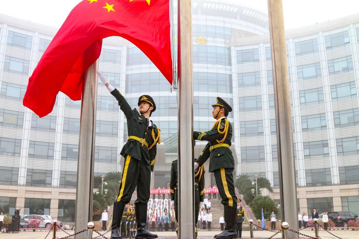 上午7点整,升旗仪式正式开始。精神抖擞的国旗手们身姿笔挺,正步前行,护送着鲜艳的五星红旗走向国旗台。伴随着嘹亮的国歌,红旗冉冉升起,全体师生肃立注目,共同见证这一庄严时刻。